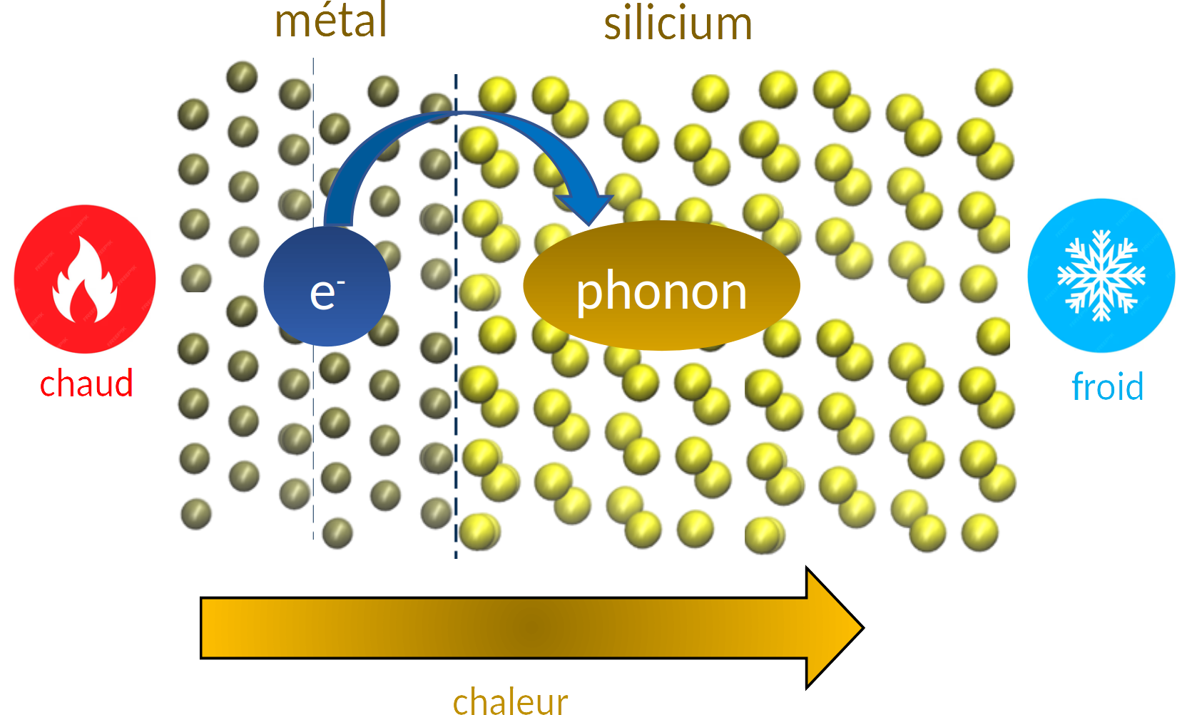 Les applications haute performance du calcul telles que l’intelligence artificielle génèrent de telles quantités de chaleur qu’il devient indispensable de réguler la température sur des échelles nanométriques. Afin de comprendre et optimiser le transport thermique entre les puces en silicium et les radiateurs métalliques, il est essentiel de comprendre le transfert de chaleur aux interfaces métal-semi-conducteur. Jusqu’à présent, il était admis que le transfert était dominé par des couplages entres les modes de vibration des matériaux (les phonons) et que les électrons du métal jouaient un rôle négligeable.