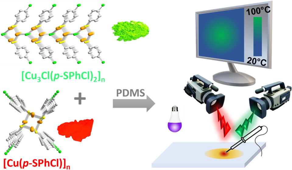 From biomedial research to mastering the art of soufflé in pastry cooking, temperature is a physical quantity that one often needs to measure with precision. However, when high temporal and spatial resolutions are required, traditional temperature sensors often fail. On one hand, thermal probes (such as thermocouples and thermistor), which needs to be in contact with the sample, cannot always be miniaturized. On the other hand, infrared cameras, are often limited when it comes to high speed image acquisition. The authors have developed and tested new photo-emissive elements, with a size of a few microns, which emits a temperature depend light signal under UV lighting, with a response time of a few milliseconds. By combining those elements in a polymer matrix, they have shown that those elements can serve as thermal sensors with a good spatial and temporal resolution. On a funnier note, they have also shown that, by playing with the proportion of each element dispersed in the matrix, it is possible to reconstruct every visible color, as with the RGB components in a computer screen pixel.